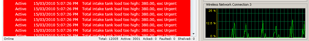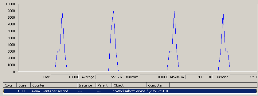 Let's look at the alarm activity: System Monitor -> CSWorksAlarmService performance object -> Alarm Events per second: